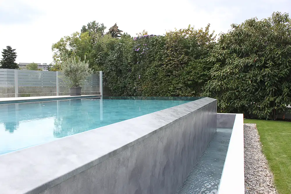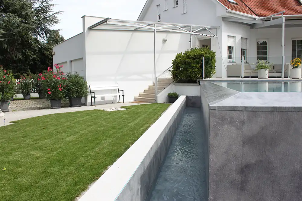 Anfang des Jahres 2022 wurden wir mit der Umsetzung eines Designerpools betraut. Bereits kurz darauf starteten wir gemeinsam mit unserer Kundschaft die Planung der Poolanlage. Nach technischen Abstimmungsgesprächen mit dem örtlichen Poolausstatter gelang es uns eine Optimallösung für unsere Kunden zu finden, die dann auch gleich umgesetzt wurde. Das Rohbauobjekt konnte in einem Zeitraum von 2 Monaten abgeschlossen und in die Hände des Poolausstatters übergeben werden. Nach Montage der Poolfolie in einer speziellen Betonoptik und Montage der Technik konnte das Becken passend zum Sommer in Betrieb gehen. Hauptaugenmerk lag in dem Projekt auf der Infinity Kante des Überlaufpools, die besonders gut gelungen ist. Wir freuen uns für unsere Kunden und wünschen langandauerndes Badevergnügen.
