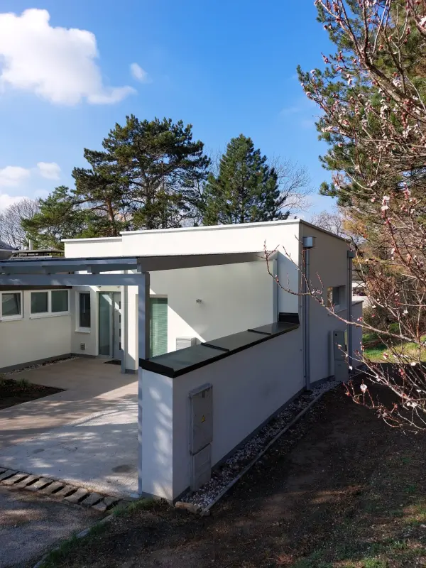 Das bestehende Wohnhaus wurde durch einen etwa 50m² großen Zubau erweitert. Die Leistungen für die Errichtung in Massivbauweise sowie Teile der Außenanlagen wurden von uns als Teil-Generalunternehmer umgesetzt.