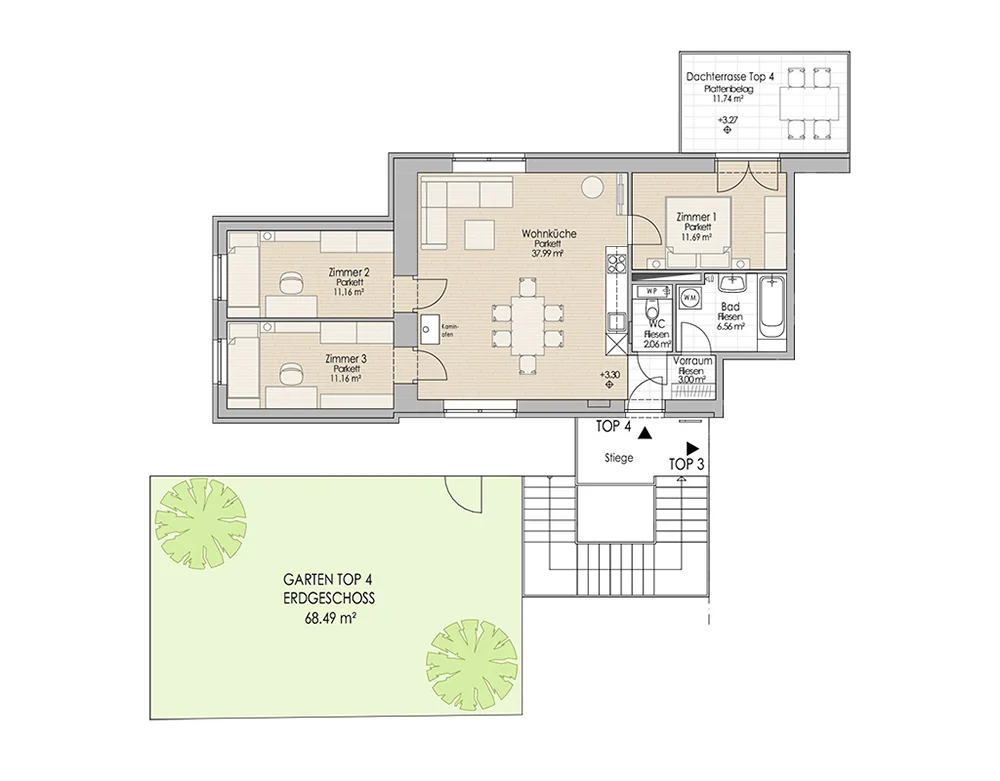 Diese exklusive Dachgeschosswohnung besticht durch ca. 83,61 m² Wohnfläche, eine sonnige Dachterrasse (11,74 m²) und einen Eigengarten (68,49 m²). Besonders hervorzuheben ist die großzügige Wohnküche mit Kaminofen, die für ein gemütliches Zuhause sorgt.